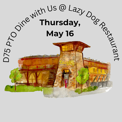 Join the Mundelein District 75 PTO for their Dine with Us event on Thursday, May 16, 2024, at the Lazy Dog Restaurant. Located at 1115 N. Milwaukee Ave., Vernon Hills. Check out their extensive menu! Print the flyer and 15% of your total bill will be donated back to the D75 PTO. See you there.